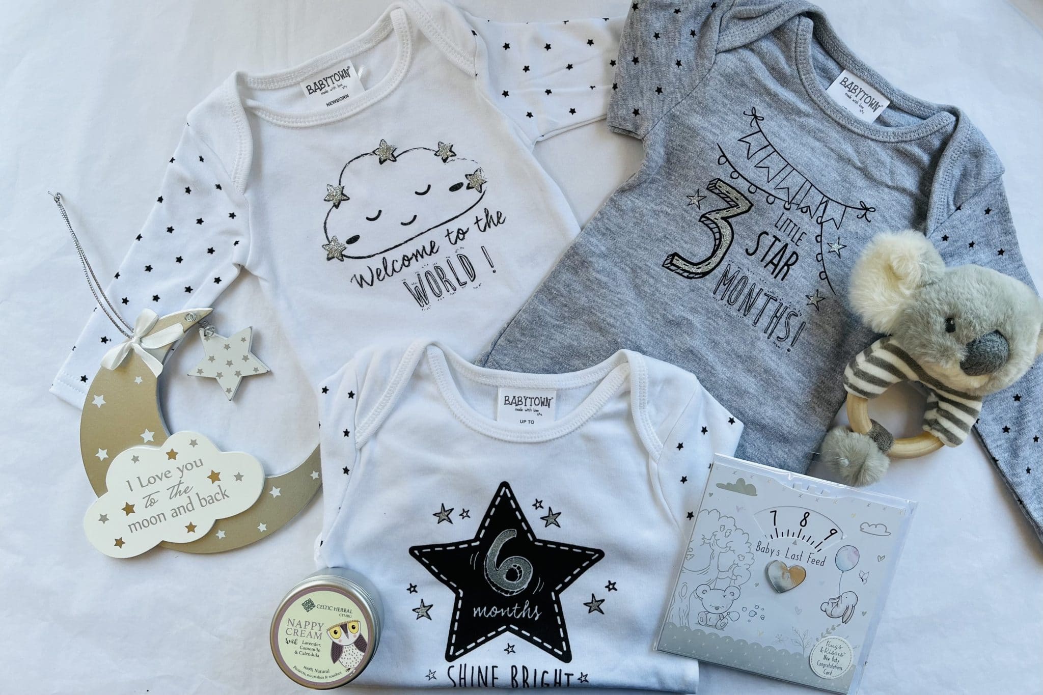 This cute baby hamper is the perfect contemporary gift to welcome a new baby to the world.
